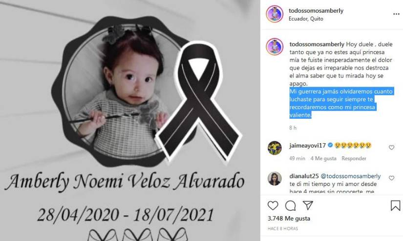 Amberly Veloz Alvarado, de un año y dos meses, murió la noche de este sábado 17 de julio, según anunciaron sus familiares en redes sociales.