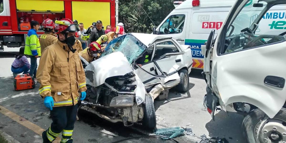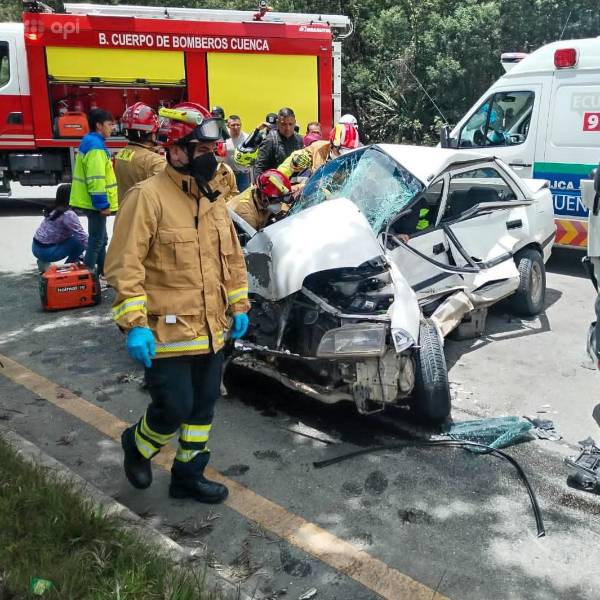 13 de abril del 2023. Bomberos de Cuenca intentan liberar a una persona que quedó atrapada en el interior de un auto tras un choque.( )