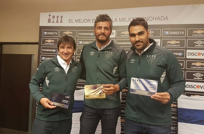 Al entrenador (c.) lo acompañarán el asistente técnico Christian Berman (d.) y Alejandro Valenzuela (i.). Foto: @LDU_Oficial