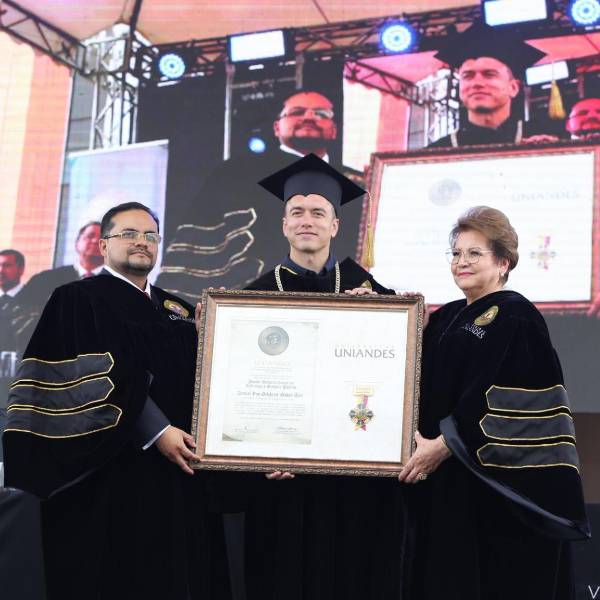 El Presidente ecuatoriano recibió el título de Doctor Honoris Causa de la Uniandes por su vocación de servir a la ciudadanía y al Ecuador. La ceremonia se realizó en la casona universitaria, donde se inauguró el campus del conocimiento Tisaleo, en Tungurahua, y el edificio 'Presidente Daniel Noboa Azin'.