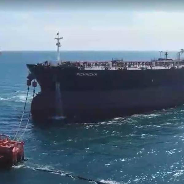 Tres remolcadores toman el control y mueven el inmenso buque hasta colocarlo con precisión frente a la boya a donde llega el petróleo por tuberías submarinas, a 7 kilómetros de la costa.