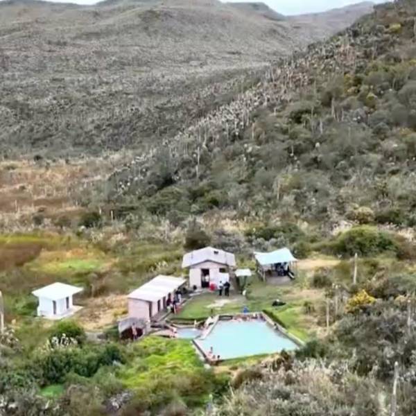 El recorrido empieza con un sendero de dos kilómetros. Son treinta minutos de caminata entre frailejones, riachuelos y el aire frío del páramo, que acompañan con un murmullo natural hasta llegar al destino: piscinas termales donde el agua brota directamente del complejo volcánico Chiles–Cerro Negro.