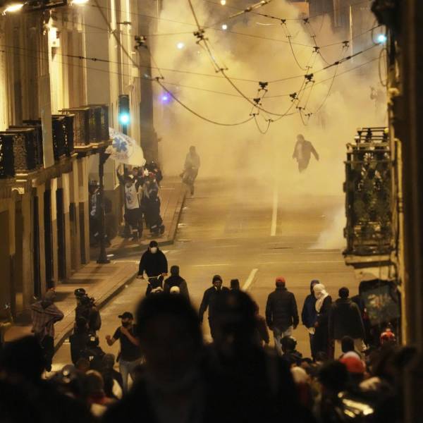 Los manifestantes se retiran durante protestas contra las políticas económicas del gobierno de Guillermo Lasso, cerca del palacio de gobierno, en Quito, Ecuador. ARCHIVO - JUNIO 2022( )