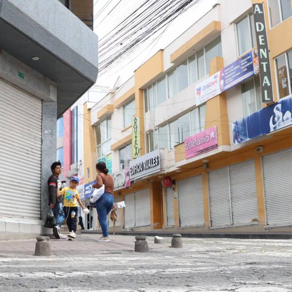 Mientras tanto, en la ciudad, los negocios permanecen cerrados. Esta es la calle Bolívar, altamente comercial. Hoy se ve así. Las puertas cerradas son la constante en las calles Salinas y Roca y en el redondel del Danzante. Casi el 95 % de los locales siguen cerrados.