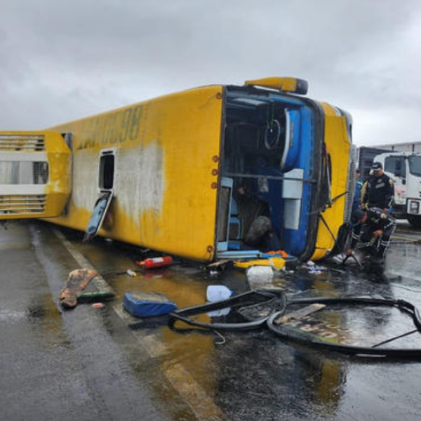 Se presume que el conductor perdió control del vehículo por la calzada mojada, y que el bus terminó volcado pese a que quiso equilibrarlo.
