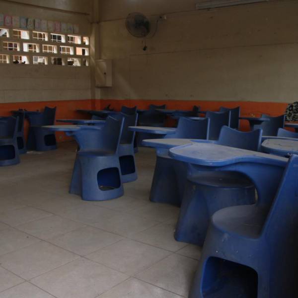 En una vista aérea de la Unidad Educativa Luis Alfredo Martínez, en el sector Realidad de Dios en Monte Sinaí, noroeste de Guayaquil, se aprecia el patio principal del plantel con un terreno irregular, con bancas apiladas en las esquinas, las paredes desgastadas, rejas de seguridad rotas, las puertas en mal estado, ventanas cubiertas con tableros pero otras al descubierto. Los estudiantes deberán atravesar un camino de lodo y maleza para llegar a la puerta principal.