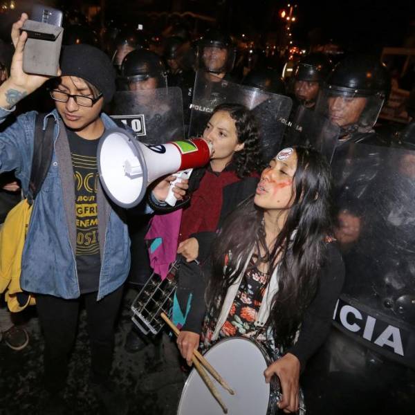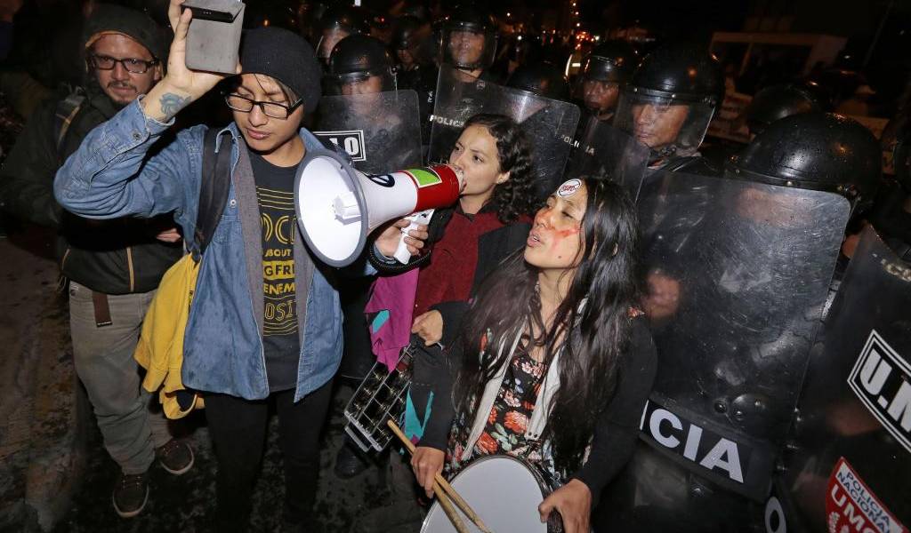 El grueso de la protesta, encabezada por una batería de tambores, retrocedió con el objetivo de evadir el cerco y continuar por las aceras hasta otro sector de la ciudad, donde tenían previsto desvelar un mural en honor a la resistencia de mujeres indígenas a los desalojos en Ecuador por causa de concesiones mineras.