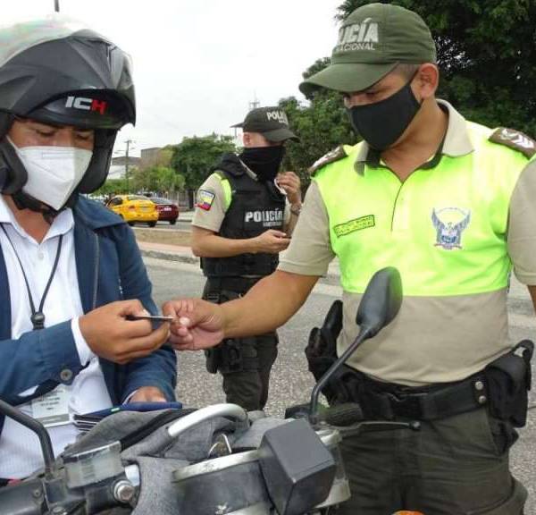 Un agente de policía pide documentos a hombre durante control en Guayaquil. Foto: Tomada de @PoliciaEcuador