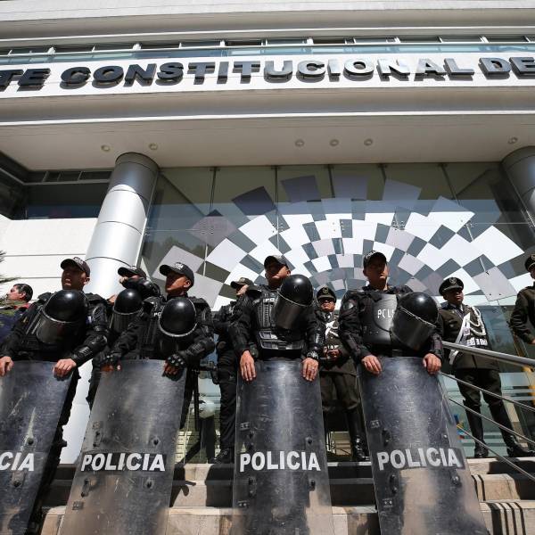 Fotografía de archivo en la que se registró a un escuadrón de la policía de Ecuador al custodiar la entrada principal de la sede de la Corte Constitucional.( )