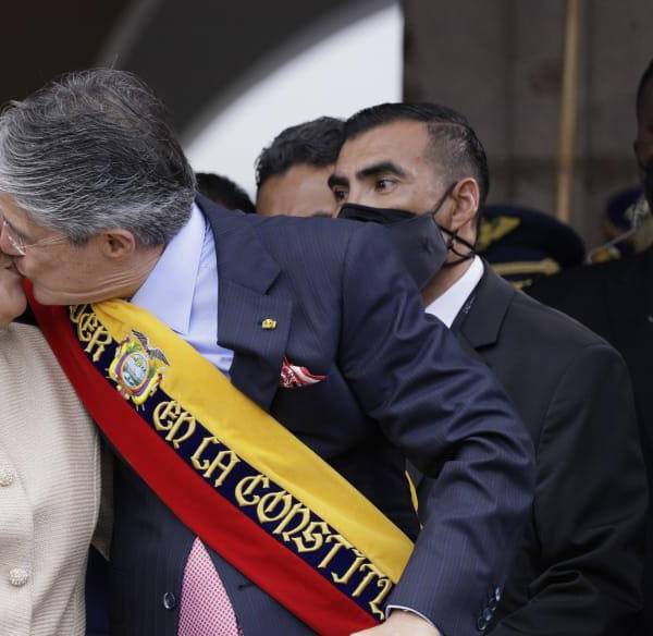En los exteriores de la sede del poder ejecutivo lo esperaban simpatizantes. Lasso se dirigió al balcón presidencial y, en medio de aplausos, besó a su esposa María de Lourdes.