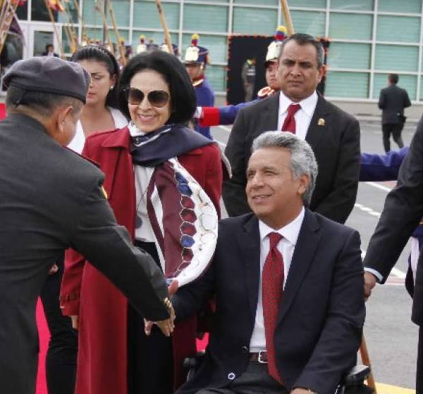 La comitiva que acompaña al primer mandatario la conforman Rocío González de Moreno, presidenta del Comité Interinstitucional del plan "Toda una Vida"; José Valencia, ministro de Relaciones Exteriores y Movilidad Humana; y Gabriel Arroba, secretario General de Comunicación.