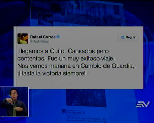 En su cuenta de Twitter, manifestó estar cansado por el viaje. Sin embargo, lo calificó de exitoso y señalo "Nos vemos mañana en el cambio de guardia hasta la victoria simpre", haciendo relación a la convocatoria que hizo para que lo acompañen hoy a las 11h30.