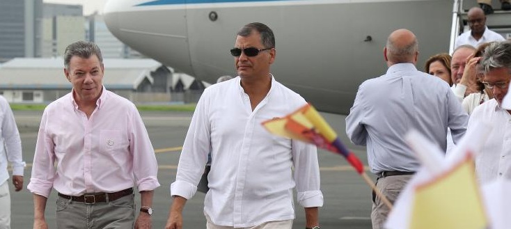 Mientras que Santos dijo a su arribo: "Son los pueblos los que salen beneficiados cuando hay buenas relaciones y visiones comunes. Ecuador es un gran socio para Colombia". Reiteró su gratitud al pueblo ecuatoriano por el apoyo al proceso de paz y por ser sede de las negociaciones con el ELN.