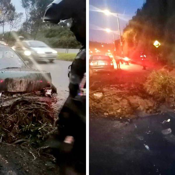 🚗 El deslizamiento provocó la caída de un poste de alumbrado público sobre un vehículo.