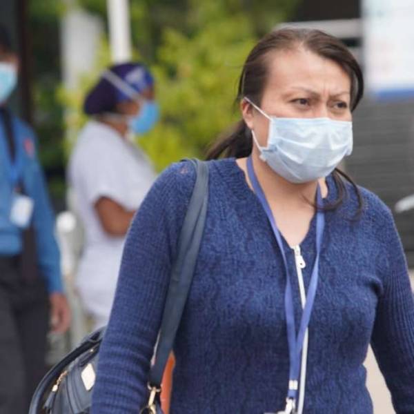 QUITO.- Mujer camina con mascarilla en los exteriores del hospital Carlos Andrade Marín. Foto: Juan Ruiz/API