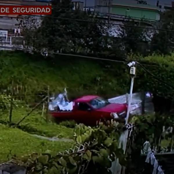 EL accidente ocurrió la tarde de este miércoles en el sector Obrero Independiente. Esta camioneta roja que transportaba bidones de agua, baja de retro a toda velocidad por la calle Consuelo Benavides.