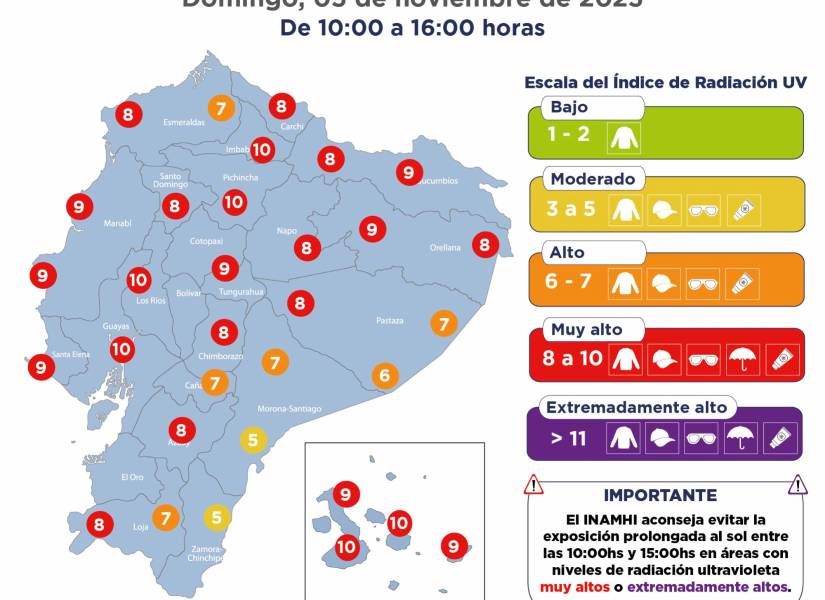 En 20 provincias del Ecuador, el índice de radiación ultravioleta estará entre 8 y 10 (muy alto), el domingo, 5 de noviembre. En las provincias de Pastaza, Cañar y el norte de Morona Santiago, la radiación será alta; mientras que en Zamora Chinchipe y el sur de Morona será moderada.