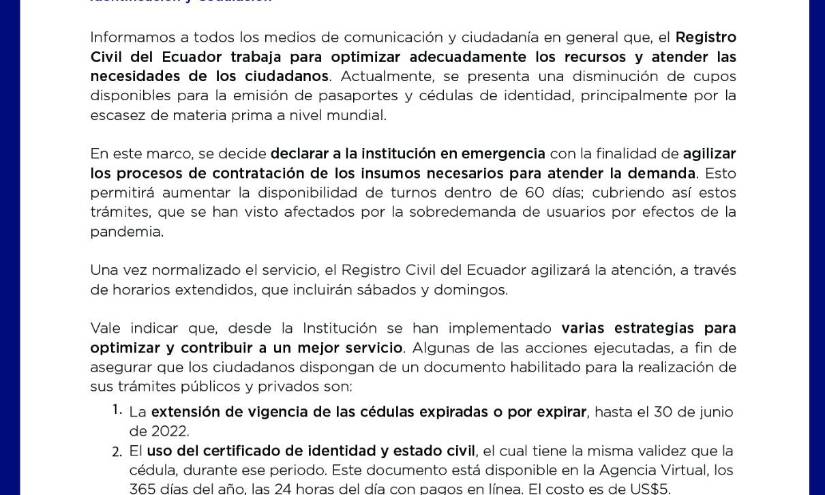 Una disminución de cupos disponibles para la emisión de pasaportes y cédulas de identidad, principalmente por la escasez de materias primas a escala mundial, ocurre en el Registro Civil del Ecuador.