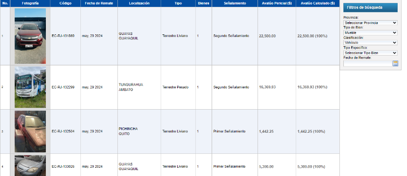 Una amplia variedad de bienes como vehículos, casas, departamentos, fincas y más están disponibles en los remates judiciales en línea del Consejo de la Judicatura. Actualmente, hay unos 1.300 bienes disponibles, con fechas de remate hasta diciembre de 2024.