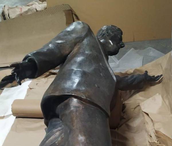 El monumento fue retirado el jueves de los bajos de la edificación de la Unasur. Una de las fotografías difundidas en redes muestra que la estatua es llevada hacia el parqueadero del edificio.