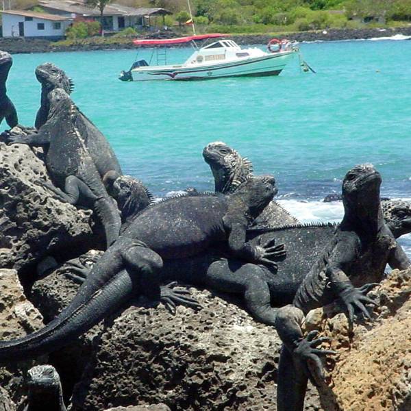 En la imagen un registro de archivo de un grupo de iguanas marinas en una de las islas Galápagos.( )