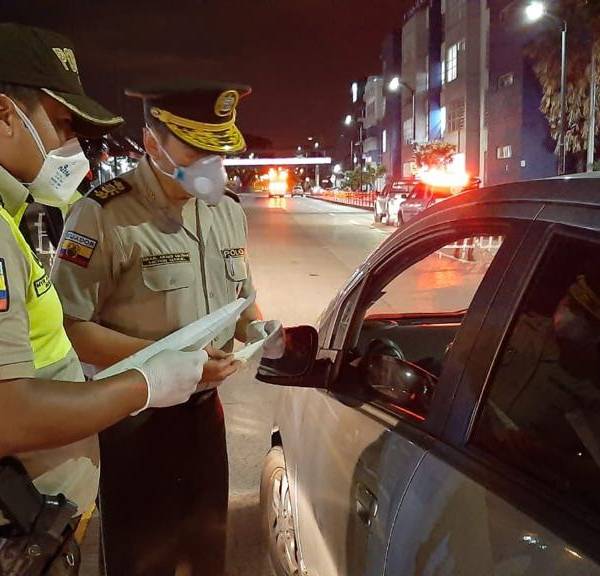 Policías revisan documentos y salvoconducto de conductor en Guayaquil durante toque de queda. Foto: API