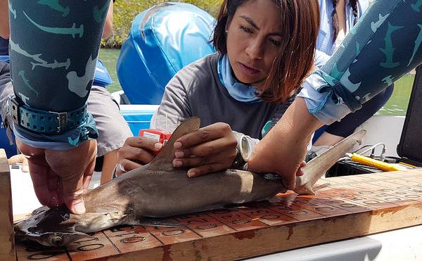 En el nuevo sitio se contaron alrededor de 30 tiburones juveniles, nueve de los cuales fueron capturados y marcados con dispositivos de identificación interna y externa para estudios posteriores.