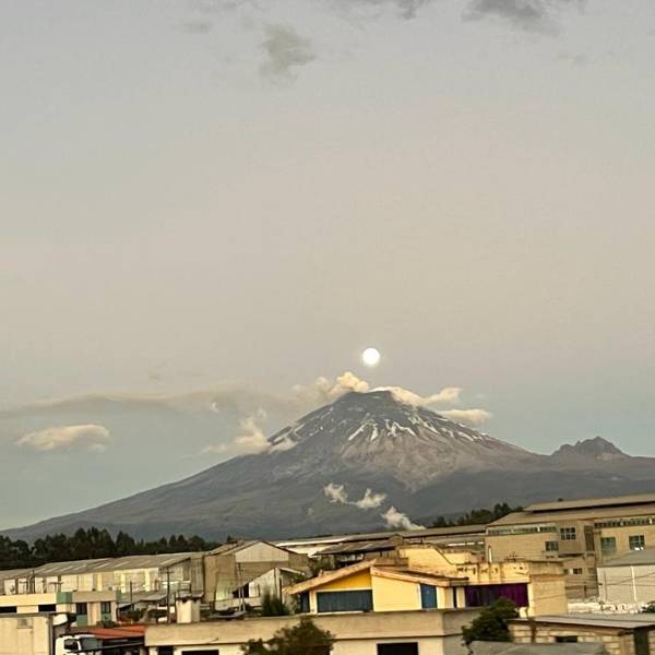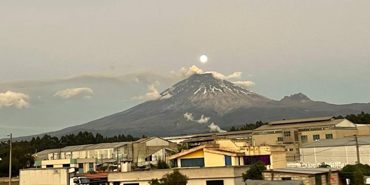 La tarde del sábado 4 de febrero del 2023 se pudo observar, desde la carretera Panamericana Sur, cómo la luna salió desde el horizonte y paulatinamente se ubicó sobre el cráter del volcán Cotopaxi de 5.987 metros sobre el nivel del mar.