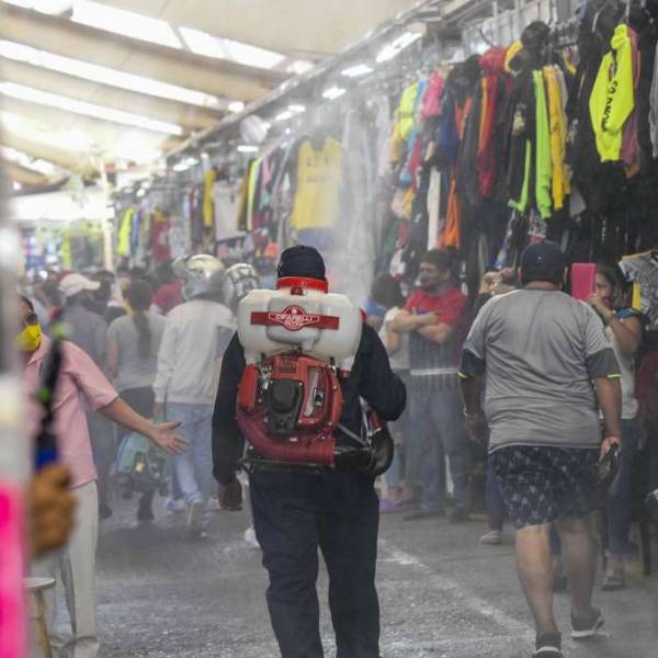 Por esto, al mediodía, autoridades municipales empezaron a fumigar cada rincón de los locales comerciales: las aceras, las calles, incluso los puestos donde están los vendedores informales.
