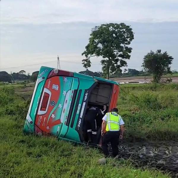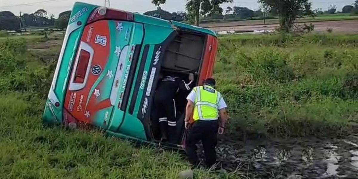 Un bus intercantonal terminó volcado a un costado de la carretera este domingo 23 de marzo.