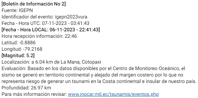 El Instituto Oceanográfico y Antártico de la Armada del Ecuador (INOCAR) publicó en redes sociales que este sismo no reúne las condiciones para un tsunami en las costas continentales y peninsulares del país.