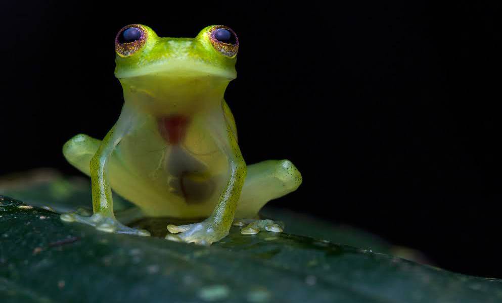 De vientre transparente que permite ver el corazón y el estómago, entre otras órganos internos, las ranas de cristal son verdes en su parte superior y miden unos cuatro centímetros.