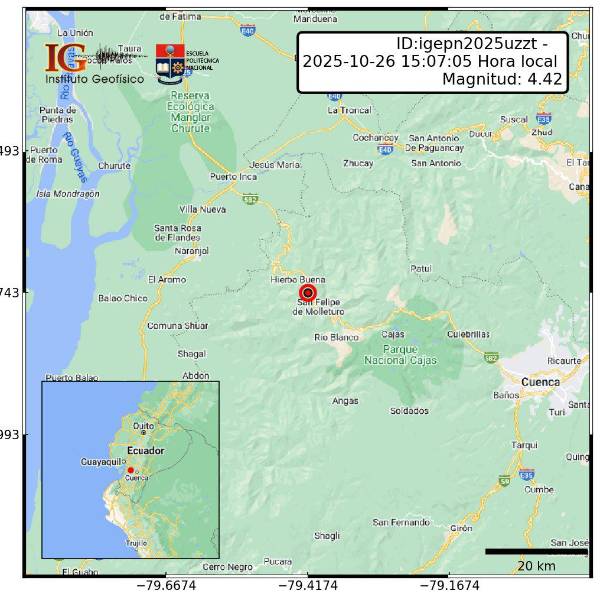 El Instituto Geofísico del Ecuador (IG) reportó un sismo de magnitud 4.4 ocurrido este domingo 26 de octubre a las 15:07 en la provincia de Azuay. El evento tuvo una profundidad de 15 kilómetros y se localizó en las coordenadas.