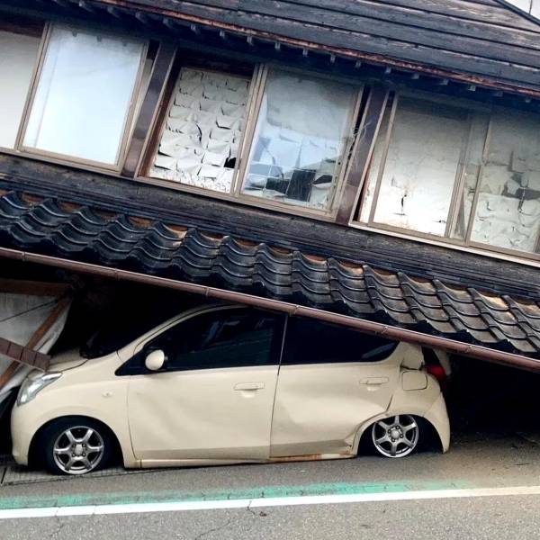 Un auto atrapado de bajo de una casa, tras el sismo en Japón.( )