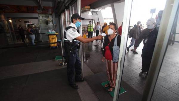 Guardia toma la temperatura a una usuaria. Foto: El Comercio.