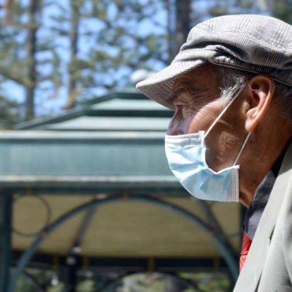 CUENCA.- Un adulto mayor camina con cubrebocas en una calle de la capital azuaya. Foto: Boris Romoleroux/API