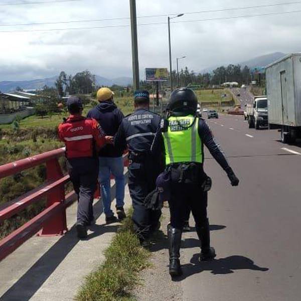 Personal de la Agencia Metropolitana de Tránsito (AMT), el Cuerpo de Bomberos de Quito (CBQ) y el Cuerpo de Agentes Metropolitanos acudieron al sitio para evitar que el hombre se quite la vida.