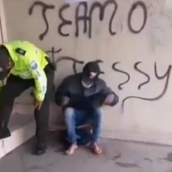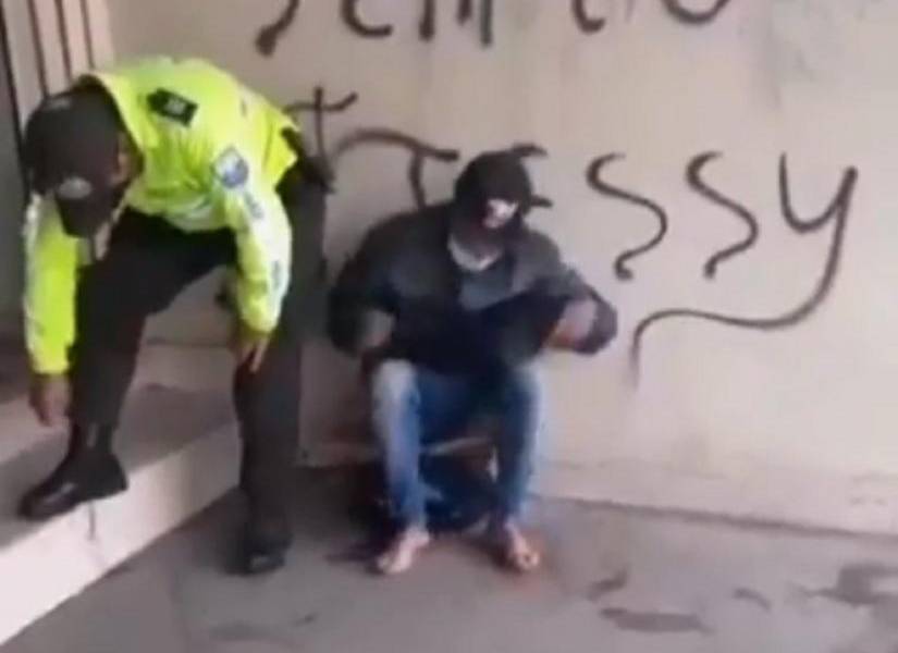 En el video, de 2.20 minutos de duración y grabado por un videoaficionado a la entrada de un establecimiento comercial, el uniformado se descalza y le entrega sus botas reglamentarias mientras le pregunta: "¿Hacia dónde se dirige?".