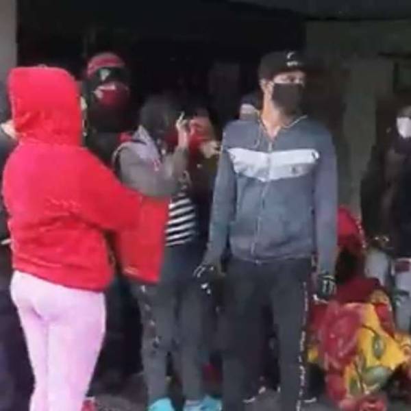 Se aglomeran para evitar sentir el frío y para guardarse de la lluvia, sin el mínimo distanciamiento y escasas medidas de protección. Son ciudadanos venezolanos que duermen en los exteriores de la embajada esperando ayuda.