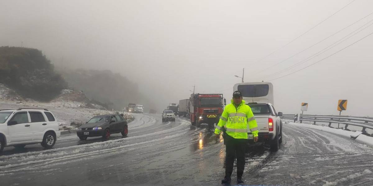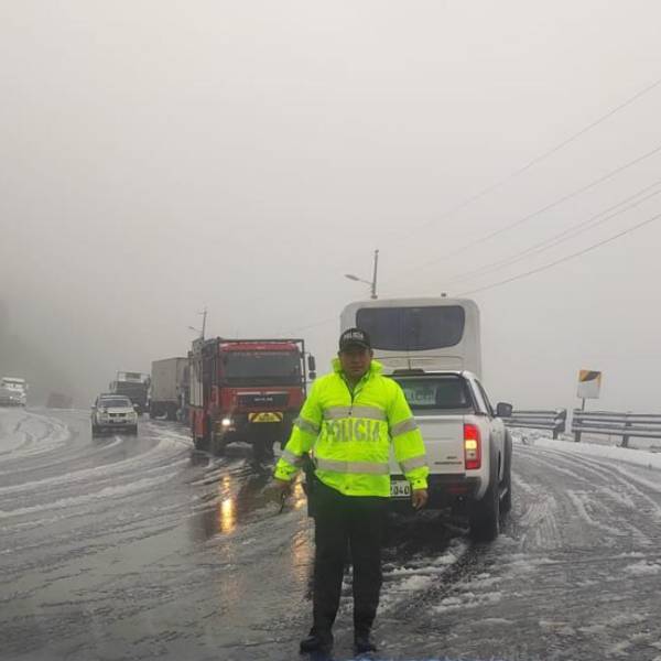 De acuerdo a la Secretaría Nacional de Gestión de Riesgos (SNGR), la nieve ha caído en casi tres kilómetros de carretera. Funcionarios del MTOP realizan trabajos de limpieza en los tramos cubiertos por la nieve.