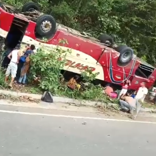 Un bus de transporte intercantonal terminó volcado a un costado de la carretera.