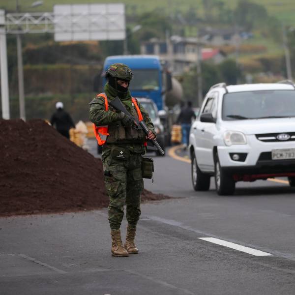 Integrantes de las Fuerzas Armadas de Ecuador revisan un vehículo este domingo 12 de octubre, en Machachi, provincia de Pichincha.( )