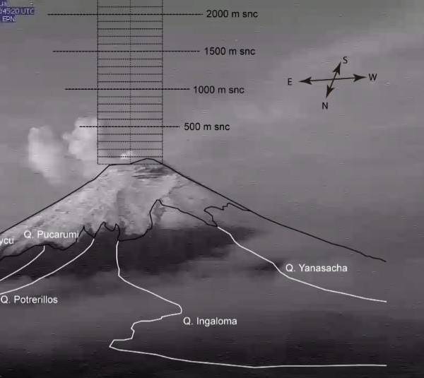 "La nube tiene contenido moderado de ceniza y podría generar caída de ceniza leve en la provincia de Cotopaxi, especialmente en la parroquia de Mulaló. Este fenómeno ha sido frecuente dentro del actual periodo eruptivo", informó el Geofísico.