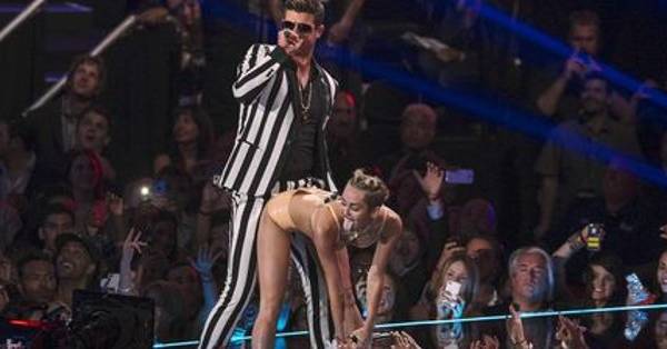 Apareció en el escenario de los MTV Video Music Awards con una multitud de ositos de peluche danzantes y el contraste fue inmediato: lo naif, y lo sexual. Ella vestía un body con un estampado simpático y tenía un peinado de dos rodetitos bastante infantil. Comenzó a bailar al ritmo de We can't stop y todo lo aniñado se convirtió en pura provocación. Erótico es poco. Miley enloqueció a la platea con sus movimientos y realmente sorprendió por lo osada. Al término de la canción, se sacó el body y quedó sólo con una bikini color piel. En ese momento ingresó en escena Robin Thicke, que fue el blanco de una nueva coreografía erótica al ritmo de Blurred lines.