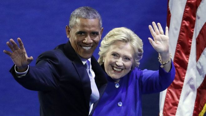 Hillary Clinton apareció por sorpresa al concluir el discurso de Barack Obama en la Convención Nacional Demócrata de Filadelfia.