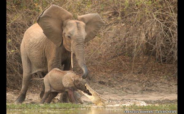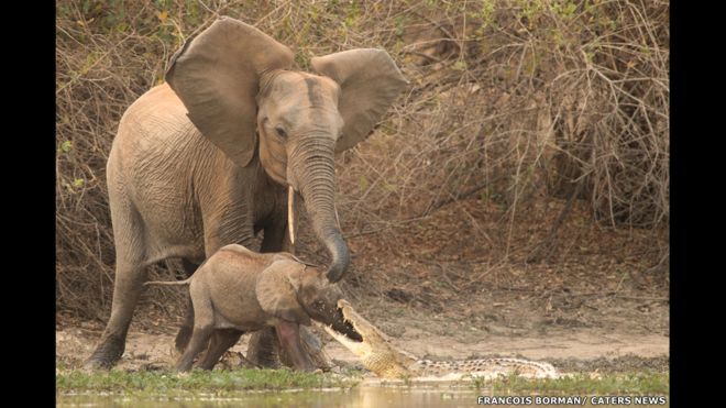 "Los otros elefantes se fueron hacia el cocodrilo y eventualmente dejó ir al bebé elefante".