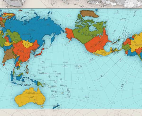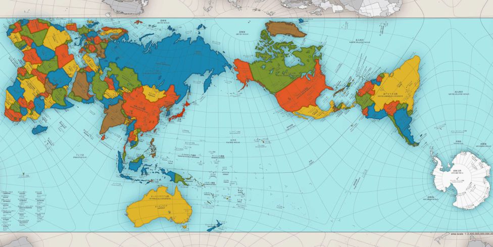 El mapa puede no ser el más conveniente para la navegación y parecer extraño a primera vista, con un cambio en la orientación de Asia y América del Norte.