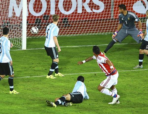 Siete minutos después, un riguroso penalti cometido sobre Ángel Di María propició el primer gol de Messi en la Copa América merced a un disparo seco a la izquierda del meta paraguayo.