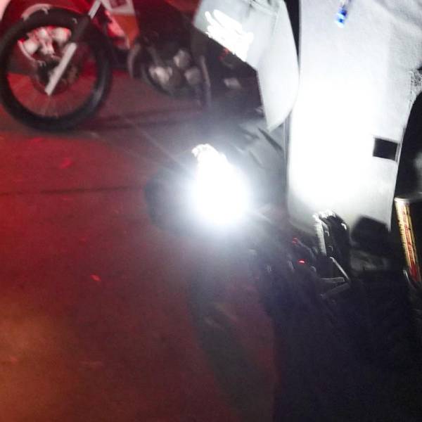 Foto referencial a un apagón. Un policía encendiendo una linterna en un sitio oscuro.( )