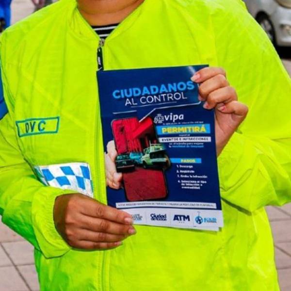 Foto de una agente de tránsito promocionando la descarga de la aplicación VIPA, para que los ciudadanos puedan reportar infracciones.( )